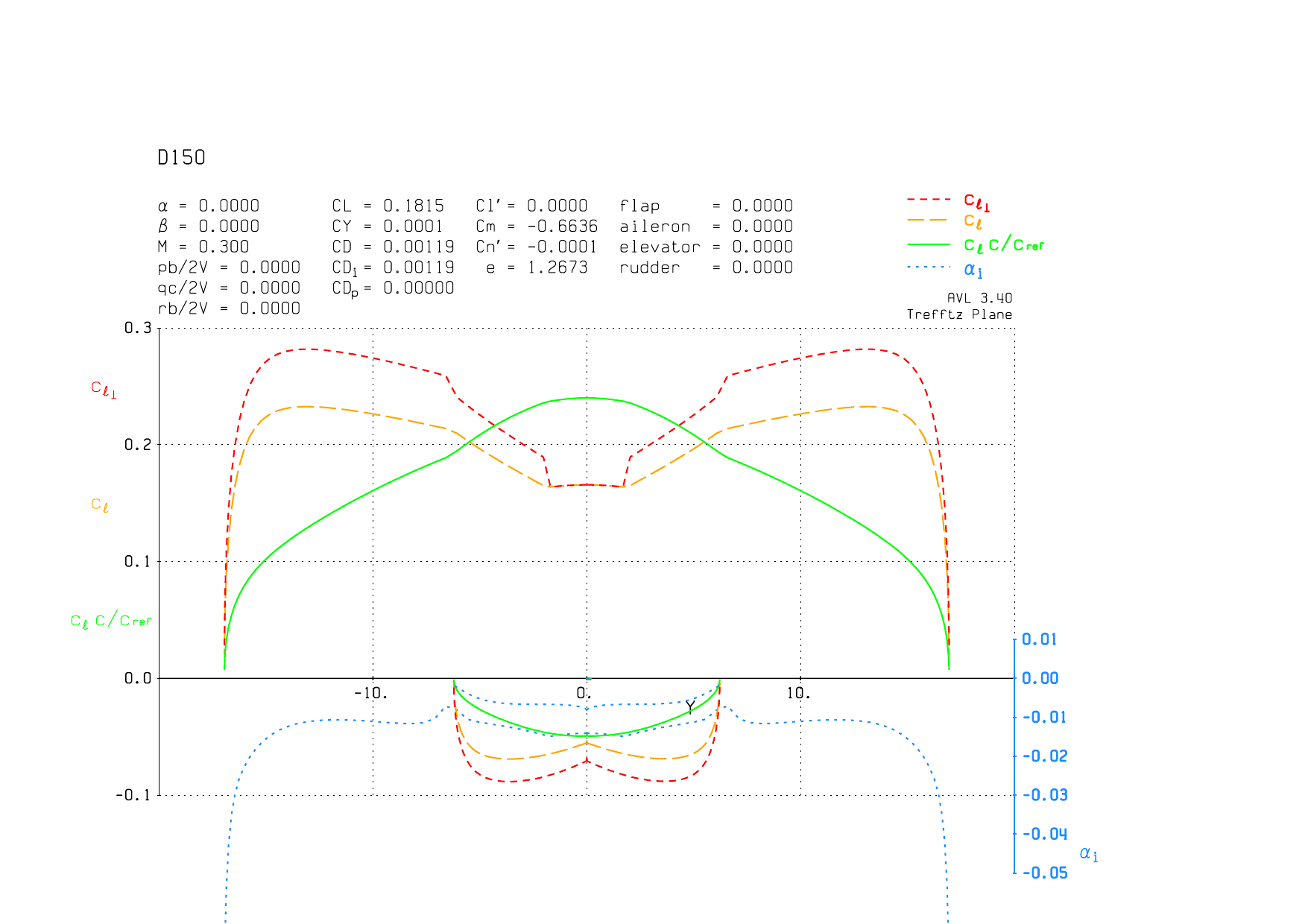 plot.pdf: it contains a plot of the initial AVL geometry model, and a plot with the aerodynamic loads on the aircraft.lift_distribution.png: plot of the lift distribution along the span.